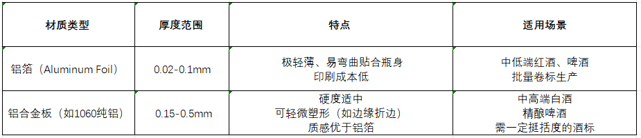 金屬鋁酒標(biāo)牌常用兩種基材,需根據(jù)酒類定位匹配: